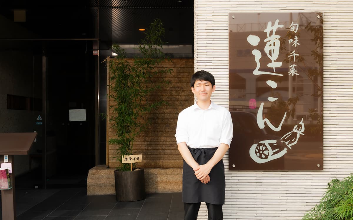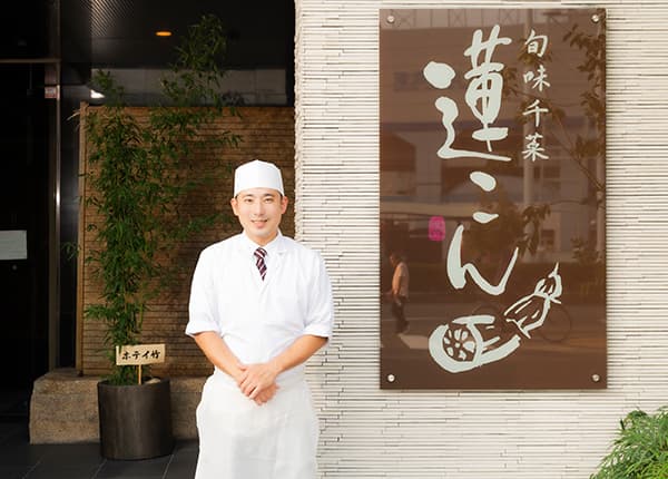 石川県で加賀蓮根を育てる農家に生まれたオーナーが、その縁を店名に込めて開いた日本料理店「蓮こん」。