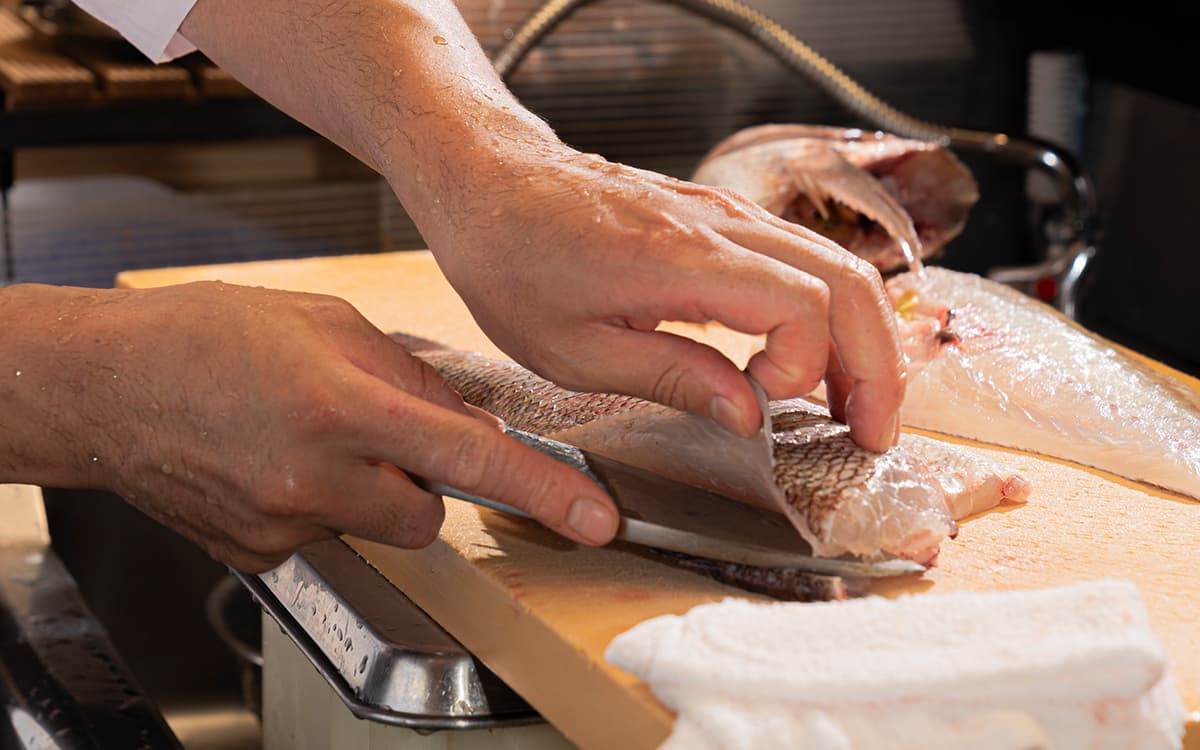 調理の朝に活け鯛を締め、すぐに加工することで、鯛本来の弾力と脂の甘みを逃さず閉じ込めました。